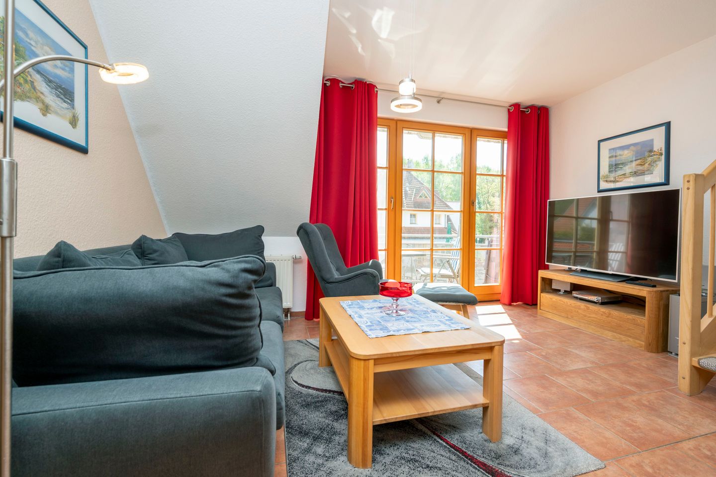 In der ersten Ebene lädt das Wohnzimmer mit Sitzgruppe, TV, DVD-Player, sowie ein Esstisch für 6 Personen zum Verweilen ein.