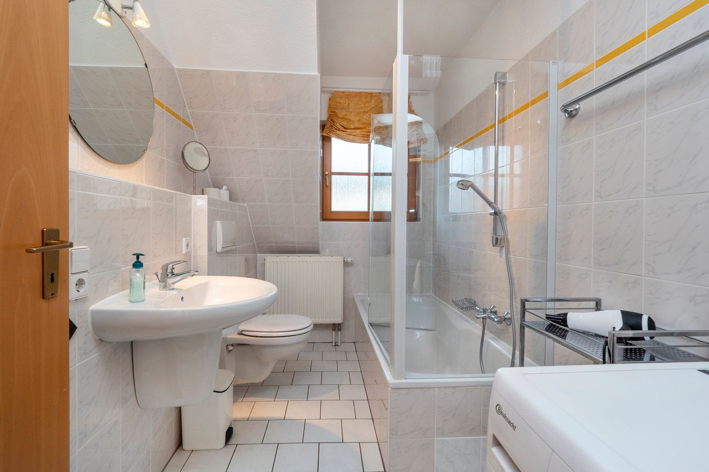 Im Badezimmer befindet sich eine Badewanne, Waschbecken, WC und Waschmaschine.